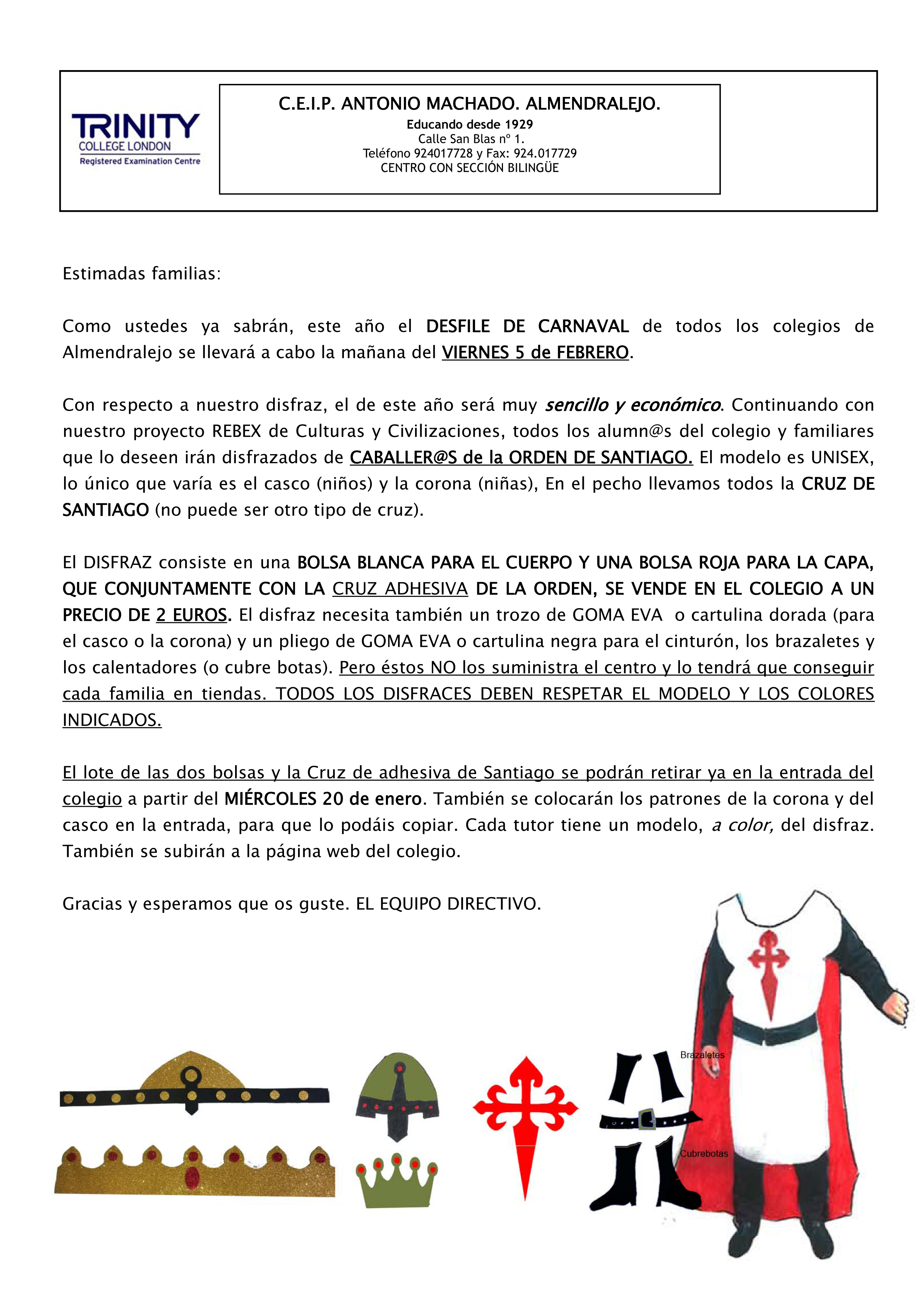 – JUEVES 29 DE NOVIEMBRE. DESFILE DE LA CHAQUETÍA. Los alumnos de infantil 3-4 y 5 años llevarán a cabo un DESFILE disfrazados de castañeros y castañeras con las cestas de los Tosantos. Los trajes serán confeccionados en talleres que se llevarán a cabo en el propio centro por familiares de alumnos y profesores. EL DESFILE COMENZARÁ A LAS 11:30 HORAS y el recorrido será el siguiente: SALIDA DEL CENTRO, PLAZA DEL DONANTE DE SANGRE, JARDINES DE SANTA CLARA, ALEDAÑOS DEL AYUNTAMIENTO, CALLE REAL, PARQUE DE ESPRONCEDA Y VUELTA POR EL MISMO RECORRIDO.